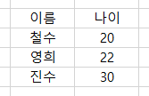 아래와 같이 저는 이름과 나이가 적힌 엑셀파일이 있습니다.