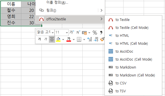 엑셀(excel)을 사용하다 보면 엑셀에 있는 값을 Texttitle, HTML, asciidoc, markdown 등으로 변경해야 할 때가 있습니다.