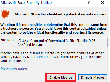 2. 다운로드 한 폴더내에 xls2textile.xlam 을 실행합니다.